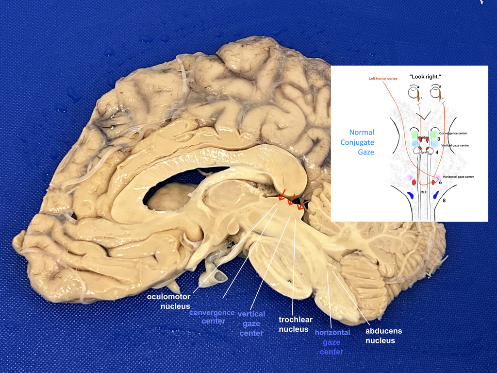 A pineal tumor in the quadrigeminal cistern can compresses the tectum of the midbrain. In addition to causing occlusion of the cerebral aqueduct and subsequent hydrocephalus in the lateral and third ventricles, it would also compress gaze centers. Can you see which two would be involved? Vertical and convergence. The loss of these gaze functions is called Parinaud's syndrome. The issue in this case however, is not with these centers but with the horizontal gaze center. Return to the case to try again.
